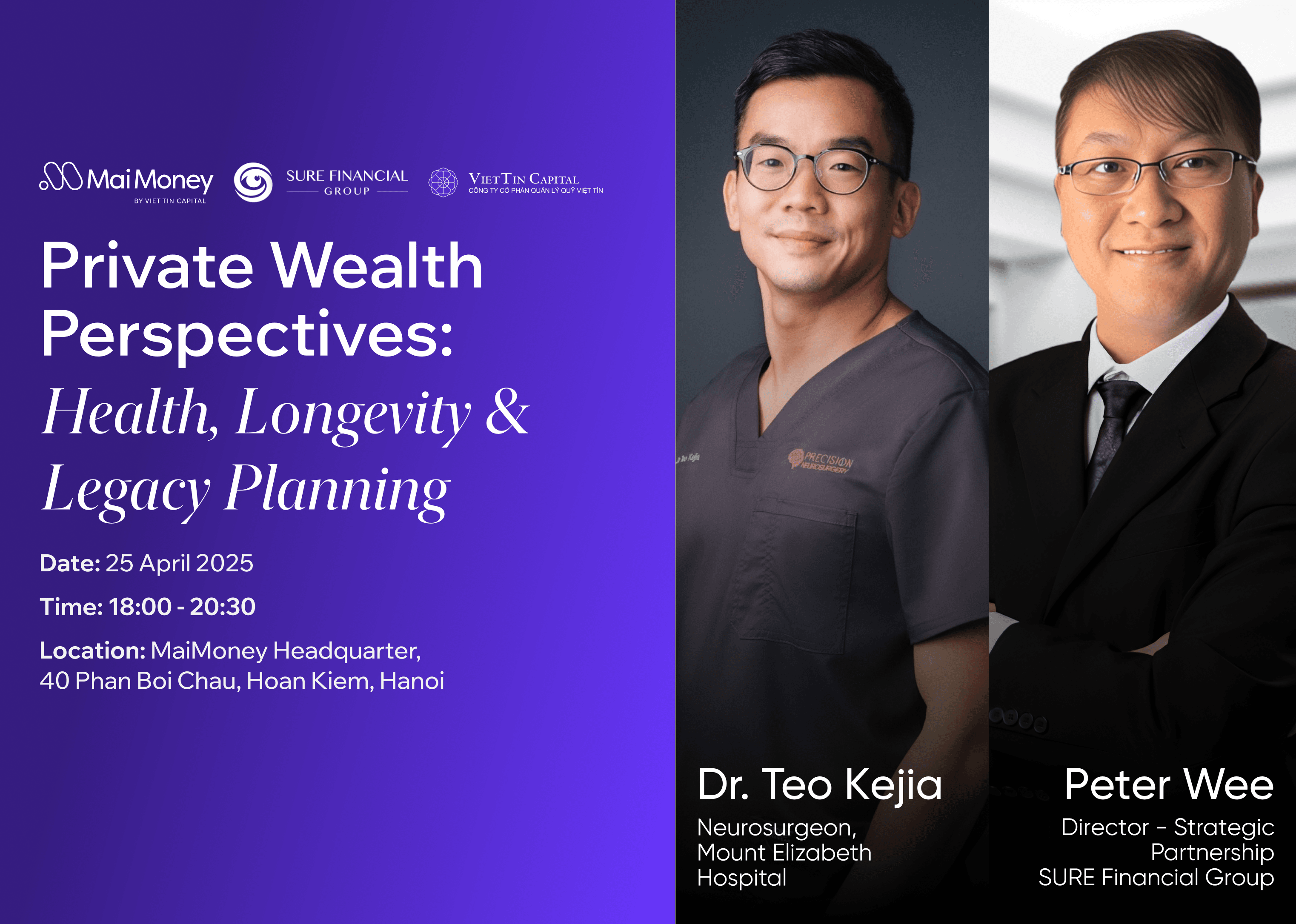 Với mong muốn truyền cảm hứng sống chủ động – cả về sức khỏe lẫn tài chính – Chương trình “Bảo vệ sức khoẻ và xây dựng tài chính bề vững” là sự hợp tác giữa MaiMoney, Công ty quản lý Qũy Việt Tín và SURE Financial Group. Đây không đơn thuần là một buổi hội thảo, mà là nơi kết nối những mối quan tâm thiết yếu nhưng thường bị bỏ quên trong cuộc sống bận rộn: cơ thể, tâm trí và ví tiền của bạn.